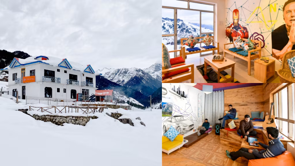The snow covered facade, vibrant common room, and colourful wall art at Zostel Rajgundha