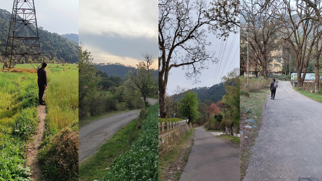 (Left to right) The hike trail from the backyard of Zostel Homes Harabhag brought us to the main road, which finally led to the Shanan Power House