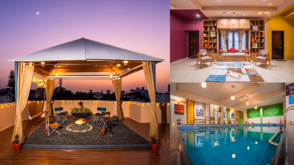 The cosy rooftop, lievly common room and indoor swimming pool at Zostel Indore