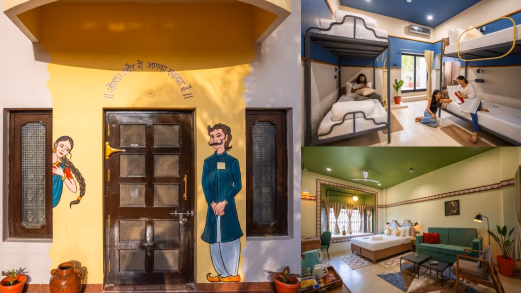 The entrance, buzzing dorm room, and private room at Zostel Indore